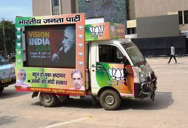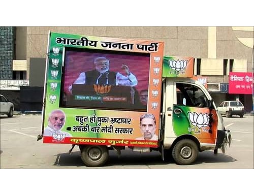 Each vehicle is equipped with HD LED screens, sound systems, and power backup for 24×7 operation in rural and urban areas.